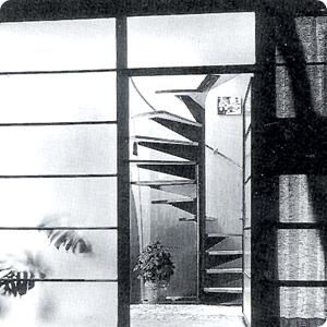 1949- A spiral staircase leading to the second floor of the house is lighted by a square wired-glass skylight. The stairs are made from sections of steel beam formed into flanges, welded onto a pipe collar, and fitted into position on a vertical column. |